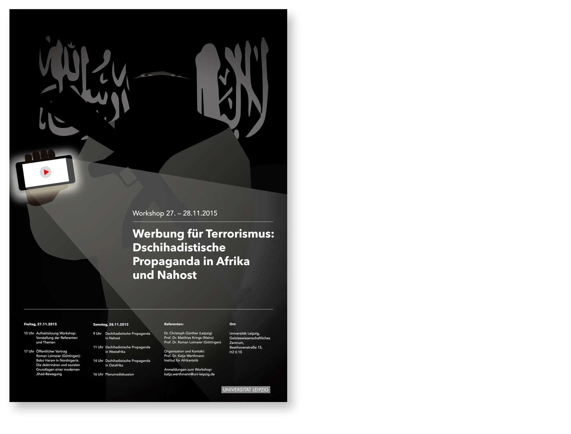 The Poster was designed for a workshop which took place at the University of Leipzig about jihadist propaganda: “Werbung für Terrorismus: Dschihadistische Propaganda in Afrika und Nahost” (“Advertising for terrorism: jihadist propaganda in Africa and the Near East”).”