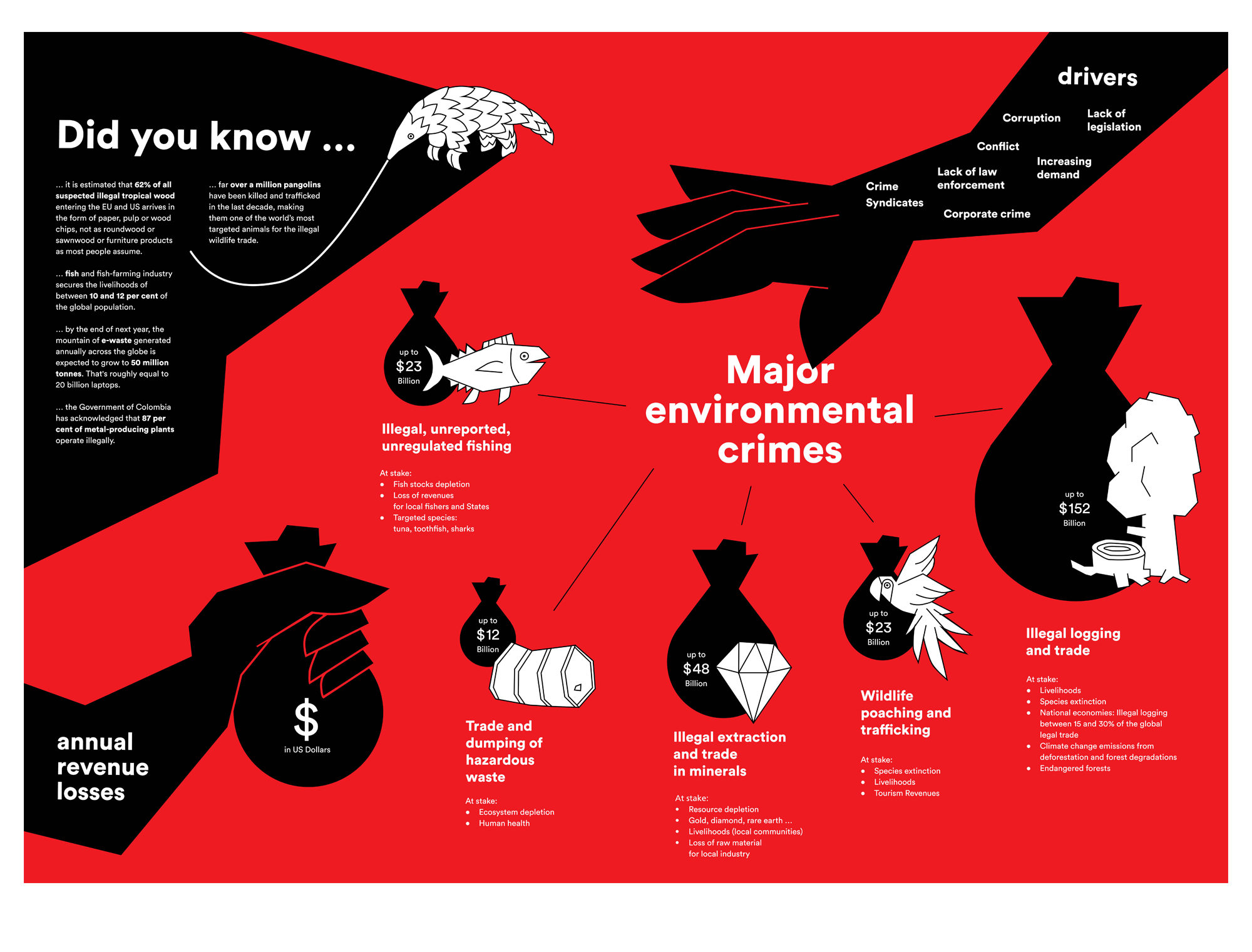 In this issue of Our Planet, government leaders, policymakers and experts explore the growing and complex threats from environmental crime and the political and legal frameworks needed to counteract it.