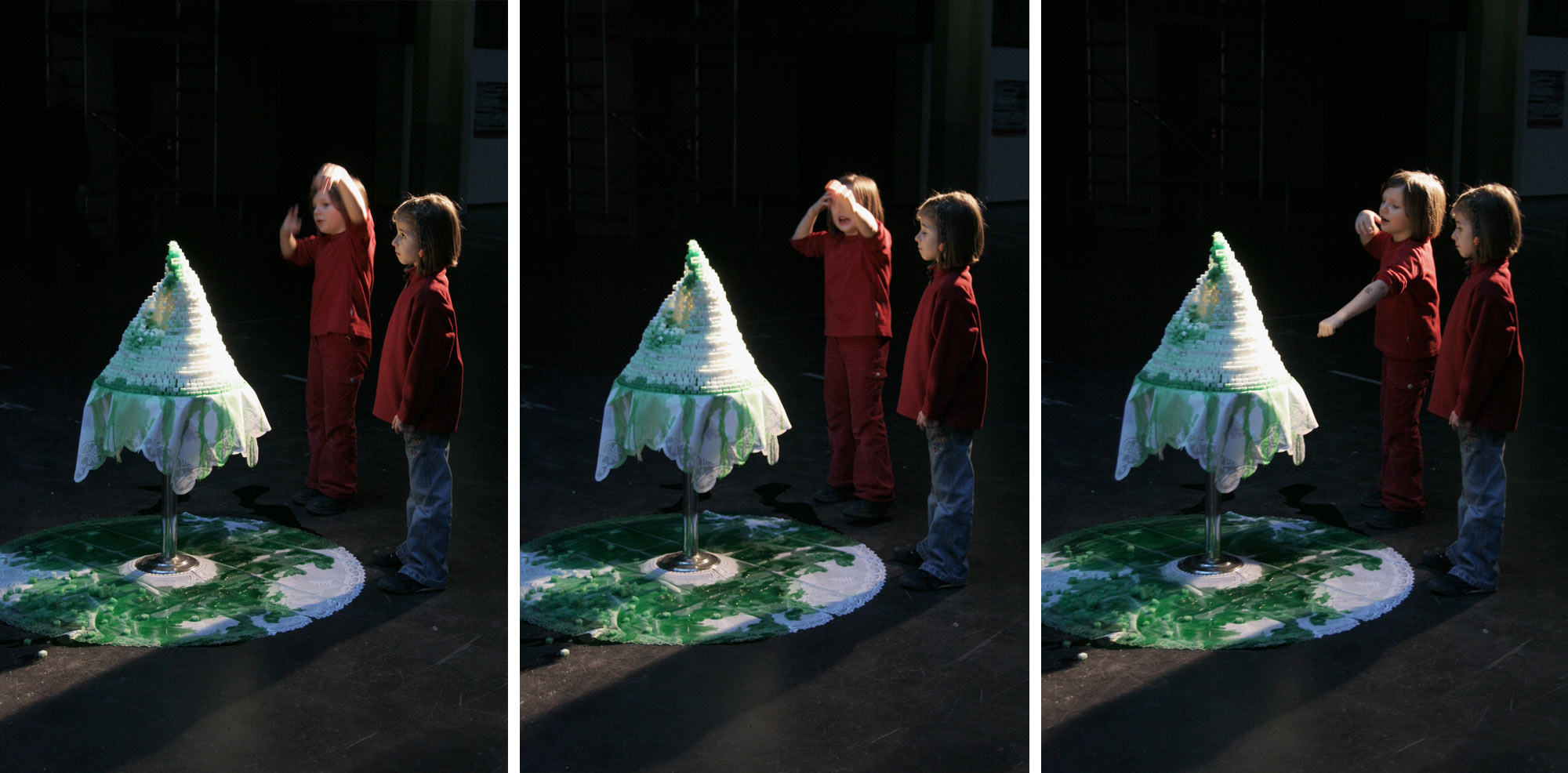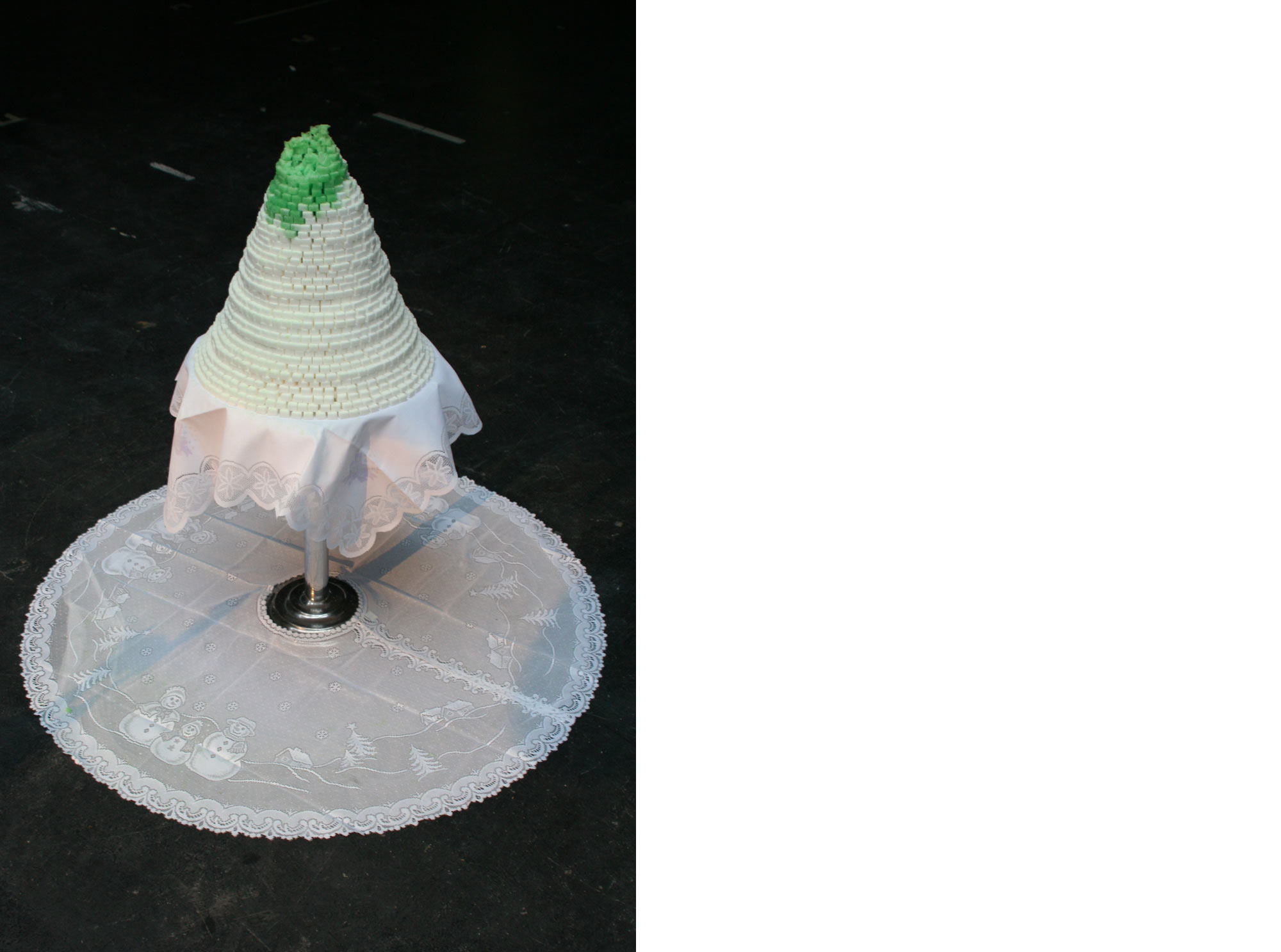 Every year the christmas tree exhibition is taking place for a week at the university of arts and design Karlsruhe. The sugar tree was made of lump sugar piled up as a white, glittering tree. A drip filled with liquid green food color was installed invisibly 10 meters above the tree. Small drops of green color were dripping over a period of 7 days and slow by slow destroyed the sugar tree. The greener the tree became the more the sugar dissolved and melted away.